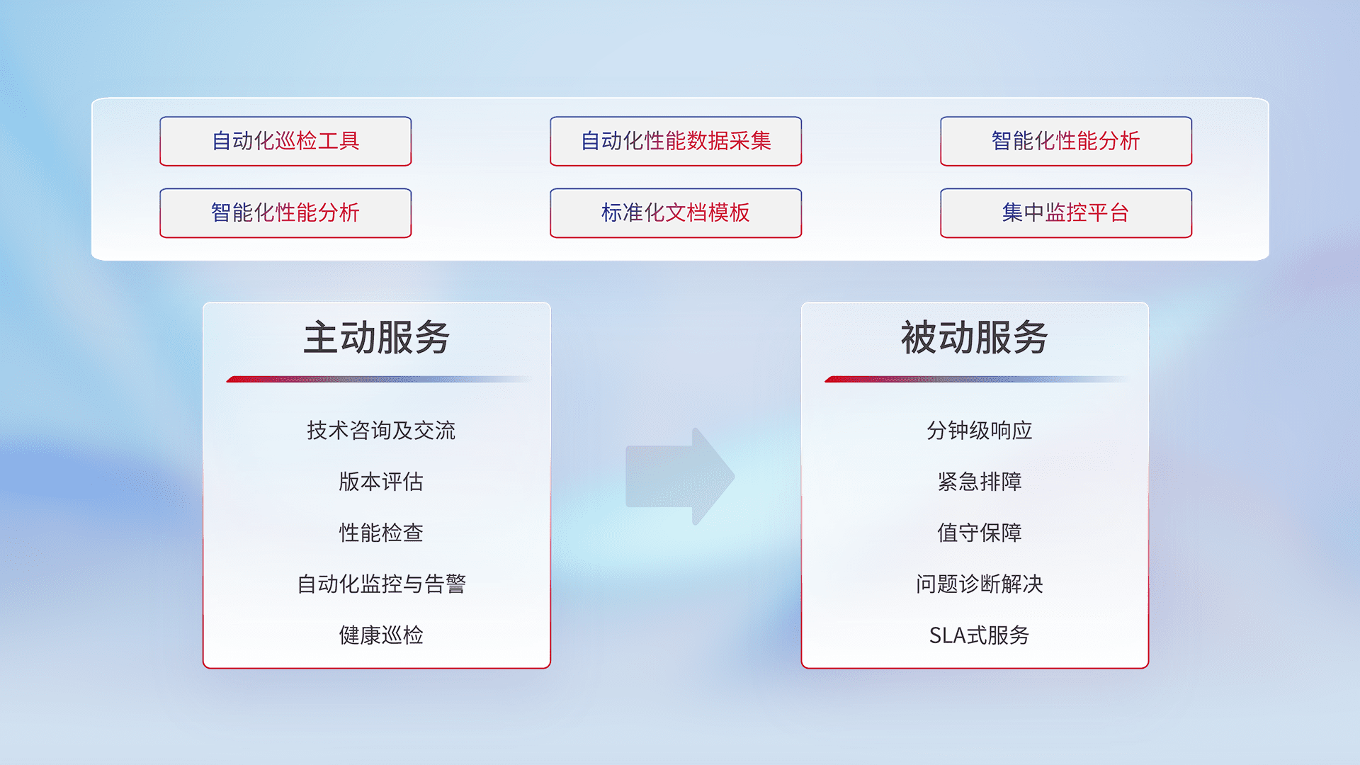 智能化工具和标准化文档,,保障服务质量,,提供主动服务(包含技术咨询、、版本评估、、、性能检查、、自动化监控与告警、、、、健康巡检)和被动服务包含(分钟级响应、、、、紧急排障、、、值守保障、、、问题诊断解决、、SLA服务)。。。